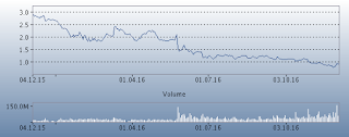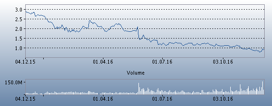 Según se puede apreciar en el siguiente gráfico tomado de la propia página web de la entidad (cotización bursátil por acción-volumen de contratación entre el 4-12-2015 y el 4-12-2016), el valor de la acción sigue una clara tendencia bajista: